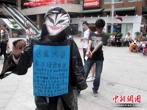 中新網洛陽5月24日電 (記者 師紅壘 通訊員 余啟兵 吳伊曉)身著用舊報紙、塑料袋,分發環保小貼士、環保綠絲帶……日前,洛陽師范學院的53名環保志愿者來到洛陽市新都匯市場,開展了一場“低碳生活、和諧洛陽”環保時裝秀表演(如圖),吸引了眾多市民前來駐足觀看。