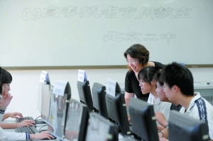 昨日,北京二中,學(xué)生們?cè)诶蠋煹妮o導(dǎo)下進(jìn)行高考網(wǎng)絡(luò)報(bào)名。本報(bào)記者 薛珺 攝