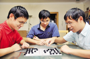 ■ 葉誠亮(左)、葉誠明(右)、葉誠輝三兄弟在家中切磋棋藝 見習記者 孫中欽 攝