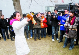 來自山東濟南藝校的戴安娜一陣清脆的快板立即引來媒體的鏡頭。戴安娜說,她學了兩年多山東快書和快板,目前已經能表演多個小段,和兩三個傳統(tǒng)大段快板書。今天的初試主要考朗誦和集體小品,小品由8個人一組集體表演,戴安娜所在小組抽到的題目是“意外的財富”,小組考生們自編了一個關于分家產的故事。戴安娜說,她對今天的初試充滿信心。