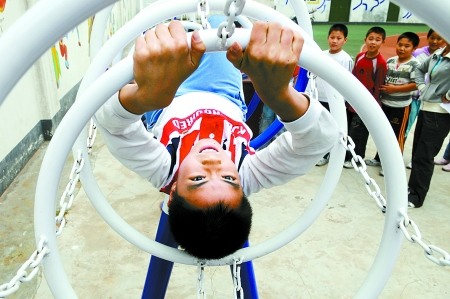 五年級的小學生徐成林排隊坐在一個名叫“過山環梯”的器材上,面朝上躺下,然后憑著手和腳的力量在環形的器材里,像只小蟲一樣蠕動前進。