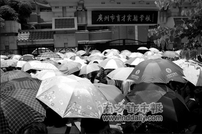 在育才實驗學校門口,從佛山開車過來的李女士告訴記者,他們一個早上跑了3個地方才找到考場,“一開始以為是育才中學,跑到那邊才知道弄錯了,后來又跑去了附近的第109中,第三次才找到這里。”