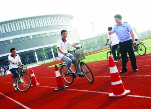 “嗯,這次騎得不錯,照這樣,通過考試沒有問題!”昨天下午3點,在南師大附屬揚子中學的操場上,30多名學生騎著自行車,在跑道上一遍一遍地繞樁。“樁”是6個一字排開的隔離錐桶,每個間距約3米。交警十大隊副大隊長張曉冬在一邊對學生進行指導。