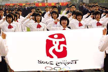 10日下午,?趭W運班的同學宣誓為北京奧運努力學習,做出自己的貢獻。 本報記者 黃一冰 攝