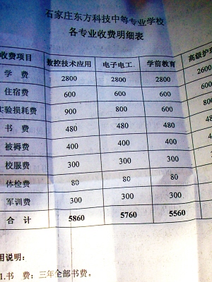 如果學生想自己找實習單位,就要交3000元錢。其中1000元是注冊費,2000元是伙食費。“我們是與石家莊協和醫學院聯合辦學的,發的是那所學校的畢業證,注冊什么的都需要錢,這個錢就得學生來出。”這位老師說,從去年5月份開始,學校的食堂就對學生和教職工免費開放了。小張去年7月從廣東打工回來,暑假后來上學,從9月到現在,在學校免費吃了7個月的飯,按每月300元算,是2100元,學校收2000元是合適的。