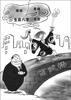 找工作面試,要先經“相面先生”看面相看掌紋;能否錄用,要由血型說了算;是否適合職位,得計算一下星座和生辰八字再說。過了“金九銀十”的網上申請、網上投簡歷高峰,11月起應聘面試進入高峰期,不少求職者在面試中屢屢遇到新招怪招,讓人“看不懂”。