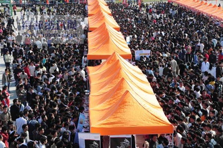 酒店“門童”、“運送員”,這些原本與大學生不沾邊的崗位,昨日(11月20日)出現在福州舉行的大學生招聘會上。昨日,由福建省人事廳、中國海峽人才市場聯合舉辦的“福建省2009年大中專畢業生福州地區大學新校區專場招聘會暨大學生見習招聘會”,在福建師范大學旗山校區拉開帷幕,有上萬名學生進場應聘。