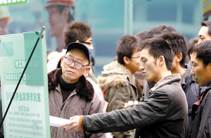 農民工專場招聘會,吸引了不少應屆大學畢業生前來應聘。他們對第一份工作的月薪期望,在1000元左右,與不少有一技之長的農民工相比,少了一半。