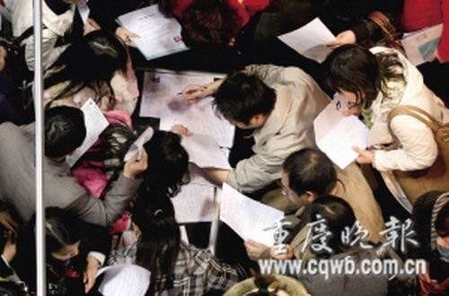 沙坪壩區(qū)人才市場舉行房地產(chǎn)開發(fā)類專場招聘,結(jié)果進場的大型知名地產(chǎn)開發(fā)企業(yè)為零,一個售樓員職位,上百人搶。