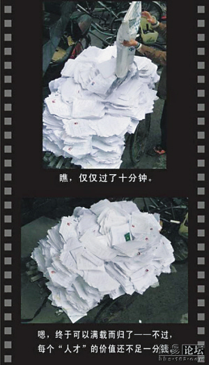 網(wǎng)友“干點什么好捏”日前在論壇上發(fā)出圖文帖《關(guān)于招聘,啥都不說了(應(yīng)屆生看完都得哭)》。展示了一組由其拍攝的,顯示大量應(yīng)聘者的求職簡歷被招聘單位當廢紙賣掉的圖片。“干點什么好捏”更別出心裁地將拍到的連串圖片以黑白膠片的形式制作串聯(lián)起來,配上旁白,并將之命名為《超袖珍的電影:一個白色的幽默》,更在標題下特別“奉勸”此片“求職者與應(yīng)屆生不宜”。