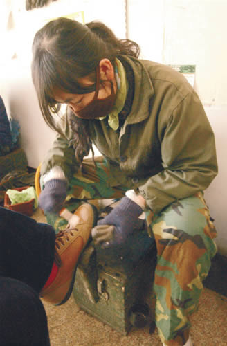 放假在家的她,白天呆在臺(tái)安縣新華書(shū)店一樓的過(guò)道里擦皮鞋,見(jiàn)有顧客來(lái),她馬上拿起鞋刷,熟練地打油上色,掙2元擦鞋費(fèi)。