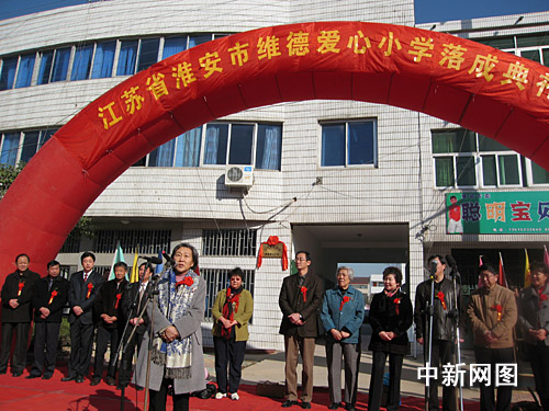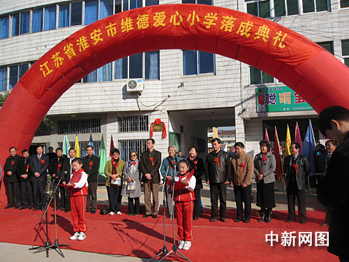 中新網淮安11月28日電 (記者 淮黎霞)一所名為“維德愛心小學”的落成典禮二十七日在周恩來總理的故鄉江蘇淮安市舉行。這所小學的捐贈人是臺胞張介玉先生和“臺灣愛心第二春文教基金會”,并由中國僑聯經濟文化基金會興建。