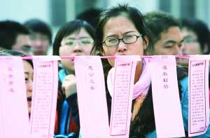 學(xué)生們對著謎語冥思苦想。昨日,中國人民大學(xué)國學(xué)院在校內(nèi)舉行燈謎會,數(shù)百名學(xué)生競相猜謎。記者 浦峰 攝