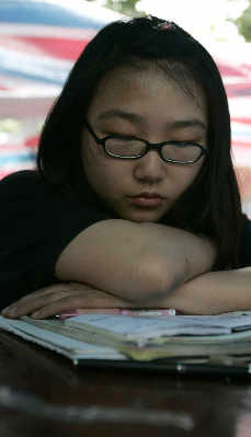 “還好當時沒到上課時間,我們班上沒人被砸死。但是有幾個同學的家長可能受傷、出了點事。”張亞秋皺了皺眉頭說,班上的師生遭遇地震后,有的不知道被安置到什么地方去了,有些則和家人逃出綿竹避難。對張亞秋來說,萬幸中的是,家中親人和同學們都無恙,張亞秋只得在災民安置點中繼續(xù)高考復習。