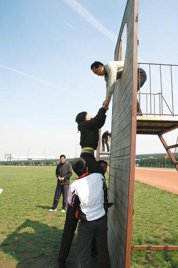 翻越營救墻項目,模擬前有高墻、后有追兵的情境,每個人都必須翻越過3米高的求生墻,大家必須相互協作,一個先上到墻頂,負責拉下面的人,有的還要負責擔當“人梯”。