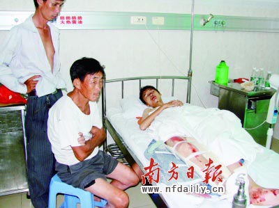 在電白縣人民醫院6樓,記者看到四肢全部被撞成粉碎性骨折的鄧學廣。鄧學廣是陳村中學初一(7)班的學生。他回憶說,早上6時30分左右他從家中騎自行車回校上課,等他發現有小汽車時,他已經被撞上了。鄧學廣的親人說,7名學生全部是男生,都是那行村人。
