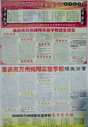 昨日,萬州多所學校老師向本報投訴稱,該區純陽實驗學校造假,編了一個叫魏來的考生,在報紙上打廣告說他考上了清華大學。記者注意到該招生廣告分兩部分,上面是“2008年純陽學校高考龍虎榜”,下面是招生簡章的具體情況。龍虎榜上是該校今年高考錄取動態,包括學生姓名和錄取院校。其中排在榜首的叫“魏來”,錄取院校是清華大學。廣告在本月14日和16日兩天刊登,一時間純陽實驗學校今年有學生考上清華大學的消息,成為當地很多家長和市民的談資。萬州某中學一位不愿透露姓名的中干說,一些家長就此拿著報紙罵他們,有那么多好的生源卻教不出“北大”、“清華”來,他們感到很是委屈。