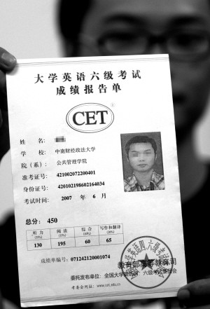 記者謊稱急找工作需要六級證書,以300元辦了一張不能查分的六級證。4天后,記者如期拿到假證,仔細對照了印章、字體、紙質、照片,甚至是防偽水印,幾乎看不出其與真證的差別。(彭欣 實習生吳少鋒)