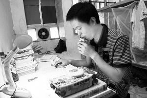 他租住在華師旁,15平方的房間200元一個月,除了衛生間,被一張高低床和一張書桌擠的滿滿當當。書桌上攤放著一本物理參考書,旁邊還堆著厚厚一摞課本和各種復習資料,桌上還有《古文觀止》、《道德經》等讀物。