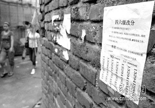 昨日上午,記者接到武昌某大學學生的投訴,稱又有人在學校附近張貼了“四六級改分”的廣告單。記者前往采訪見到,廣告標稱可“解除你找工作、升學的后顧之憂”,并留下了聯(lián)系電話和QQ號碼,不時引來學生觀看(如圖)。
