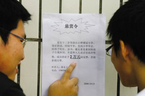 “陪孩子吃、住、讀書,最關鍵的是能扭轉孩子自我封閉的性格,成功者給予2萬元陪讀費……”昨日(10月23日),一則被同學們視為“天價”家教陪讀的“懸賞令”出現在工商大學校園內。懸賞令發布者稱,因自己拒絕買電腦,上六年級的兒子3個月不和她說話了。如今自己怎么彌補都無法扭轉孩子的倔脾氣,因此想給孩子找個陪讀,改變孩子的性格。