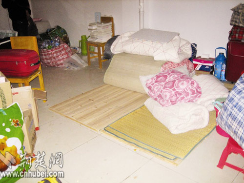 記者程翔報道:昨晚,湖北經濟學院眾多學生因無床可睡,只好打地鋪度過漫漫寒夜。“你看,這就是我們的寢室,床都被拆走了。”昨晚7時30分許,一名女學生指著一片狼藉的宿舍對記者如是說(如上圖)。據她介紹,宿舍住的是該校會計學院自考班大二的學生。大一的時候,她們住在東湖邊的濱湖校區。今年9月,學校下發通知,稱已在該校大門對面商業街旁修好了幾棟宿舍,讓她們搬過去。