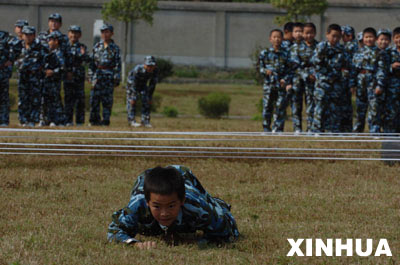 江東區(qū)兒童軍校一位小學員匍匐穿越“電網(wǎng)”