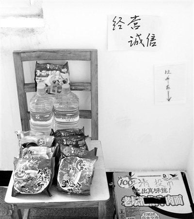 開業(yè)次日,記者在現(xiàn)場看到:一張小凳上擺著9袋方便面和礦泉水,旁邊是一個簡易投幣箱。