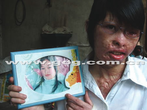 已容顏盡毀的秀娟拿著昔日長發飄逸、充滿青春活力的照片,噙著淚水向記者訴說了自己的不幸。