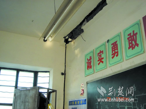 昨日下午,記者在潛江實(shí)驗(yàn)小學(xué)看到,北教學(xué)大樓已經(jīng)人去樓空。有的教室墻壁上的裂縫可以插進(jìn)手掌,有的教室天花板上的涂料全部脫落。