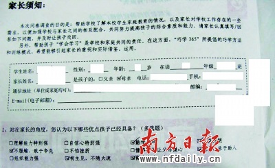 25日,深圳某新聞網站的論壇上出現一則《學校出賣學生家長信息引發(fā)的疑問》的帖子。該帖子稱,就讀深圳南山某名!氨薄粮街小钡募议L,收到學校派發(fā)一份的“調查表”:比方孩子學習成績怎么樣啊?孩子能自覺完成家庭作業(yè)嗎?孩子與父母的關系如何等等。雖然這些與中學生實際年齡不符的“調查”,令家長感到莫名其妙,但見是學校派發(fā)下來的問卷,家長們還是認真填寫,并按要求寫上家長姓名,家庭住址,電話(包括手機)號碼等。此后,就不斷受到“北京華×天驕教育咨詢有限公司”催買《天之驕巧學365家庭學習輔導》的電話。