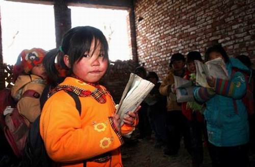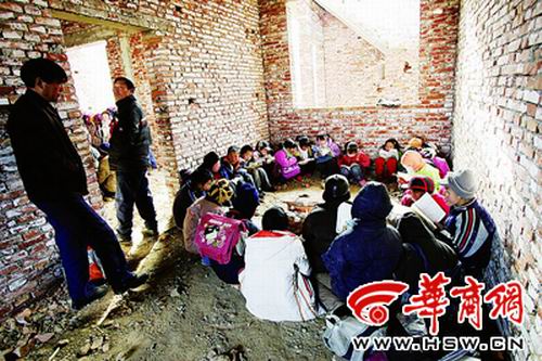 上午10時許,距董廟小學200米的地方傳來讀書聲。這是剛砌好不久的磚房,沒窗也沒門,學生分別待在幾個房間里,四下漏風,穿棉襖還是冷,大家圍成圈不停地跺著腳。老師用磚搭個簡易爐,燒些樹枝讓大家能感覺點暖意。“這種地方的確不能上課,總不能耽誤學業,只好先找個地方解決了。”老師說。