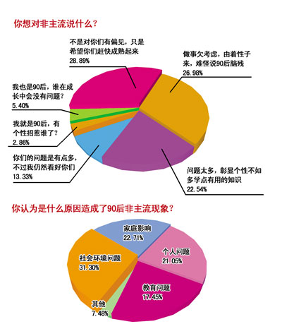 “難道靠個性就能吃飽飯,作為80后,看到你們非主流一族我很沉痛。”網友“彩虹星星”在給90后非主流的忠告這一項中如此說道。“真的對你們沒有偏見,只希望你們趕快成熟,做事不要由著性子來,追求潮流也要繼承前人的好傳統呀!”在調查中,網友們對90后寄予希望,勸他們能多學知識,讓自己成熟起來,別再出現非主流行為。