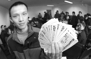 記者在現場注意到,部分學生代表拿到同學們預訂的火車票后仍愁眉不展。環境學院07級碩士研究生石昕就拿著一疊票在登記表上核對、打鉤,不時嘆息。他們班26人訂票,只拿到了14張票,其余都沒有。“不是沒票,是有票他們不要。”石昕說,沒訂到票的同學多半是往重慶、哈爾濱等方向的,都是要求太高,指定要硬臥,坐票都不考慮。這讓火車站工作人員為了難,這些地區火車票本身就很緊,臥鋪票更加有限,非臥鋪不要的要求根本無法滿足。