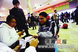 昨晚,長沙理工大學的學生胡帥和同學在售票廳里玩撲克打發時間,等待明天一早學生窗口開窗后買去鄭州的車票。圖/記者王