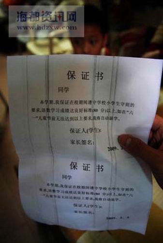 對于他兒子的說法,王先生予以證實(shí)。他說,已有學(xué)生家長交上簽好名的保證書,當(dāng)時(shí)校方叫他簽字時(shí),他婉拒了。“孩子受教育應(yīng)該是平等的,不應(yīng)以學(xué)習(xí)成績來區(qū)別,這兩天孩子一直悶悶不樂,可能此事已傷到他的自尊心了。”王先生說。