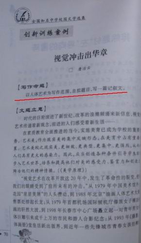 該書主編“唐治云”在引言部分提到,這是學校的一項“創新訓練案例”,寫作命題是“以人體藝術為寫作范圍,自擬題目,寫一篇記敘文”,以“視覺沖擊出華章”。