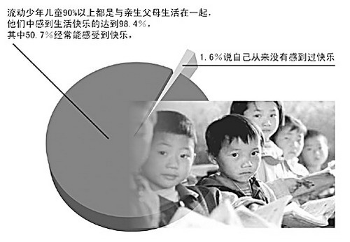盡管如此,多數流動少年兒童感到生活是幸福和快樂的。課題組認為,這與他們絕大多數能得到父母的照顧和監護有關(數據如圖一)。
