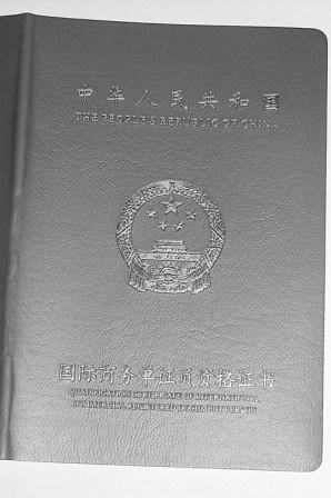 紫紅色的封面,中間燙有金色的國徽,上端還印有同樣金色的中英文“中華人民共和國”。這是一本國際商務單證員資格證書,內頁用中英文字,印刷精美,還蓋有發證單位的大紅印章。