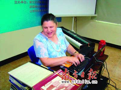 前日,在云浮市區的唯特教育培訓中心,凱文老師時而在盲人電腦上敲著英語單詞,時而站起來向學生提問。她還一邊彈電子琴,一邊教學生唱英文歌(見圖)。