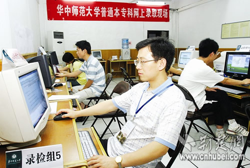 今年在全國高校中,華中師范大學(xué)是唯一一所所有專業(yè)均在湖北提前批次錄取的高校。昨晚9時,記者在華中師范大學(xué)2008年高招錄取現(xiàn)場看到,該校數(shù)臺高招錄取專用電腦已全部就位,多名招生人員正緊張地守在錄取電腦前,進(jìn)行接收投檔前的各項準(zhǔn)備工作。