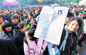 國家公務員考試昨天在全國31個考區的38個城市同時進行。據介紹,今年報名人數創紀錄地超過了105萬人,通過認證的考生約為77.5萬人,較上年增加 13萬余人,是近年來競爭最為激烈的一次公務員考試。與招錄的1.35萬個職位相比,今年的考錄比約為57:1,高于去年的46:1。最搶手的職位競爭率首次超過4000:1,有20多個崗位的競爭比例均超過1000:1。