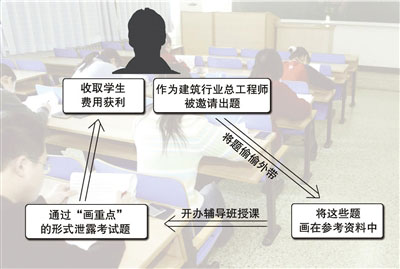 在正常教授輔導(dǎo)內(nèi)容后,輔導(dǎo)班還會有一堂特殊的課程,那就是所謂的“畫重點”。宋、宗兩人將已知的試題內(nèi)容作為串講的“重點”透露給考生,并會提醒考生“要對這些內(nèi)容特別注意”。很多“聰明”的考生花錢上輔導(dǎo)班,主要就是為了這堂課的內(nèi)容而來的。