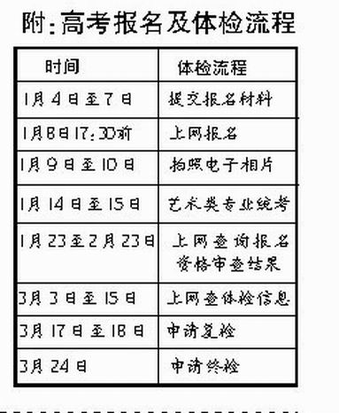 2008年高考報(bào)名時(shí)間為1月18日-23日,2009年高考報(bào)名時(shí)間為1月4日-8日。省考試局稱,報(bào)名時(shí)間之所以提前,是因?yàn)榻衲甏汗?jié)來(lái)得早,教育部要求各省必須在春節(jié)前完成藝術(shù)專業(yè)統(tǒng)考工作。