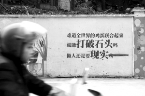 日前,讀者吳先生打進(jìn)本報(bào)熱線稱,他在南岸一新建小區(qū)外看到了這樣一條標(biāo)語,讓他很費(fèi)解,他不知道開發(fā)商打出這條廣告宣傳語是什么意思?吳先生說,這句宣傳語這樣寫道:“難道全世界的雞蛋聯(lián)合起來,就能打破石頭嗎?做人還是要現(xiàn)實(shí)些。”