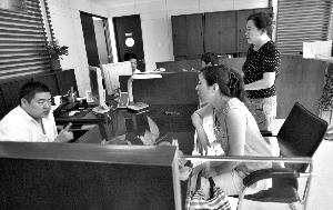 昨日是北京公共租賃住房政策實施的第一個工作日,在德勝街道辦事處,幾位市民在住房保障窗口咨詢。本報記者 薛珺 攝