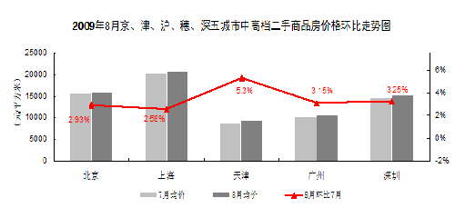 從圖表中的數(shù)據(jù)可以看出,2009年8月京、津、滬、穗、深五大城市的中高檔二手房價(jià)格均呈上漲走勢。在上述五大城市中,8月份中高檔二手房上海和北京分別上漲2.58%和2.93%。總體來看,2009年8月五大城市中高檔二手商品房在市場成交活躍的促進(jìn)作用下,價(jià)格再創(chuàng)新高。價(jià)格上漲最明顯的依然是天津,上漲了5.3%。其次是深圳和廣州,分別上漲3.25%和3.15%。