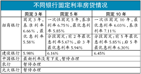 不過,如果李女士只能申請(qǐng)到基準(zhǔn)利率甚至利率要上浮10%,則選擇固定利率房貸有著數(shù)。目前5年以上貸款的基準(zhǔn)利率為5.94%,而招行的5年期部分固定利率可優(yōu)惠至5.85%,已經(jīng)比基準(zhǔn)利率還低,建行的5年期固定利率為6.16%,也只比基準(zhǔn)利率高0.22個(gè)百分點(diǎn),基本上,在央行以每次0.27個(gè)百分點(diǎn)的幅度加息一次后,市場浮動(dòng)利率就可超過目前選定的固定利率。