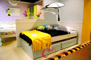 記者看到很多類似組合:高架床,床旁邊是一個小扶梯,扶梯臺階由幾個抽屜拼成,抽屜可以儲放衣物。床下面是一個轉角電腦學習桌,可以放置一臺電腦,又可以當書桌使用。在電腦桌旁還放有一個小衣柜,可以放置一些常用衣物。另一轉角處有一個文件柜,可以放學習資料和書籍。電腦桌被分隔成二層,底下的一層還可以放小物件、書籍等。大約兩平方米的空間就這樣被充分利用起來了。