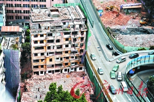 昨天下午,在東濠涌高架橋東側的圍蔽區內,錢路頭后街15號、18號兩棟樓早已完成拆遷,等待拆除。15號是一棟八層住宅樓,西側幾乎與高架橋“臉貼臉”。可就在距離高架橋幾米處,兩道幾十厘米寬的裂縫從樓頂直灌而下,裂縫中間只有數根鋼筋相連。從對面高樓往下望,筆直的裂縫直通地面,就好像用斧子劈開的一樣。